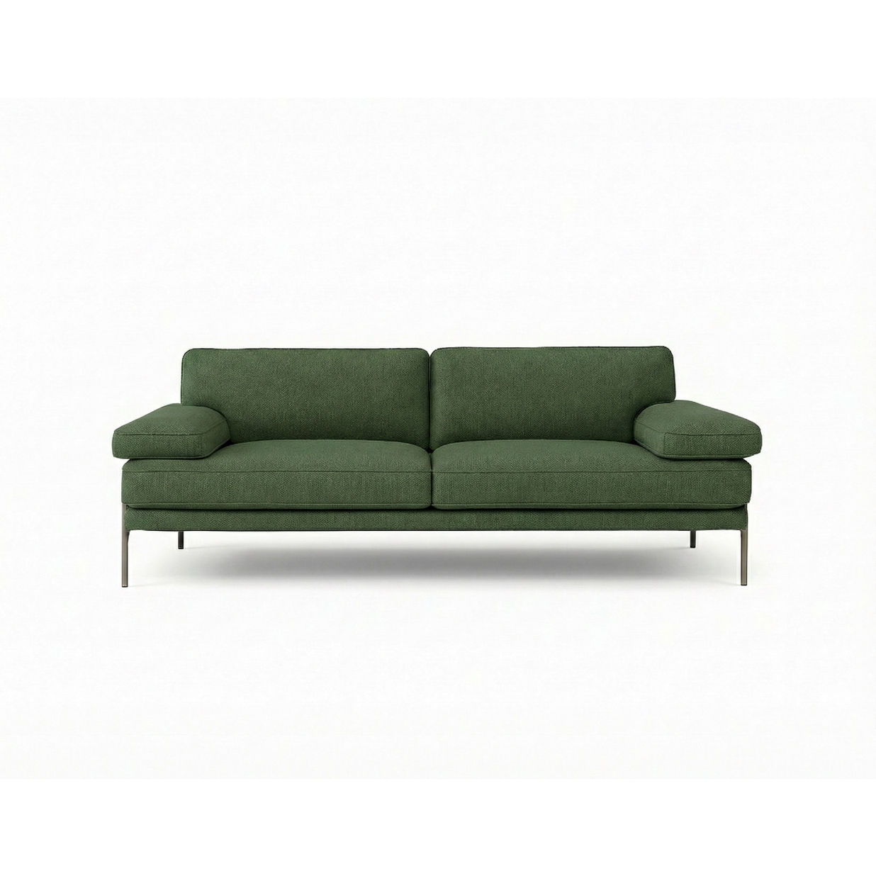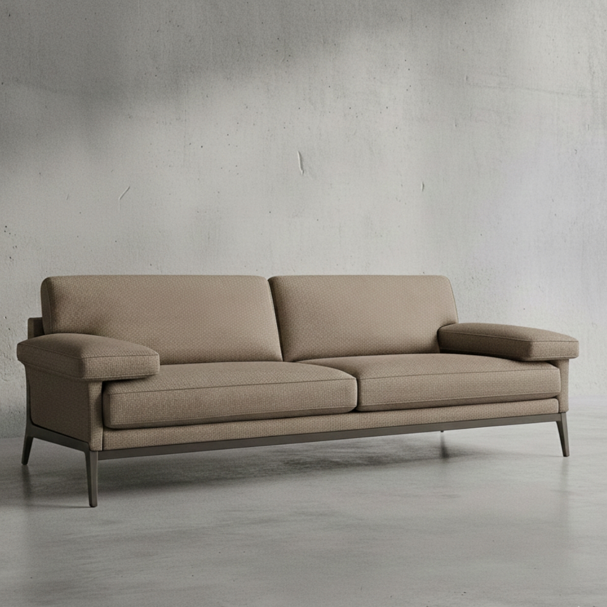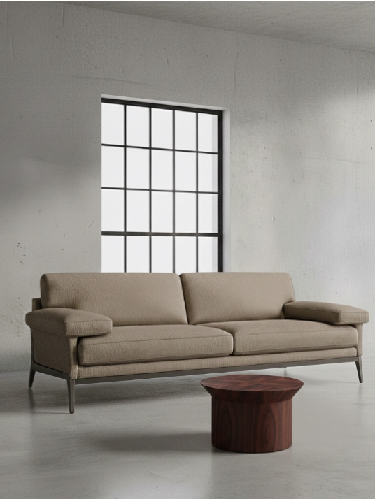 ספה במראה ביתי עם משענות צד רחבות ומזמינות ומסגרת מתכת מסוגננת, מגיעה באופציה זוגית או שלישיה