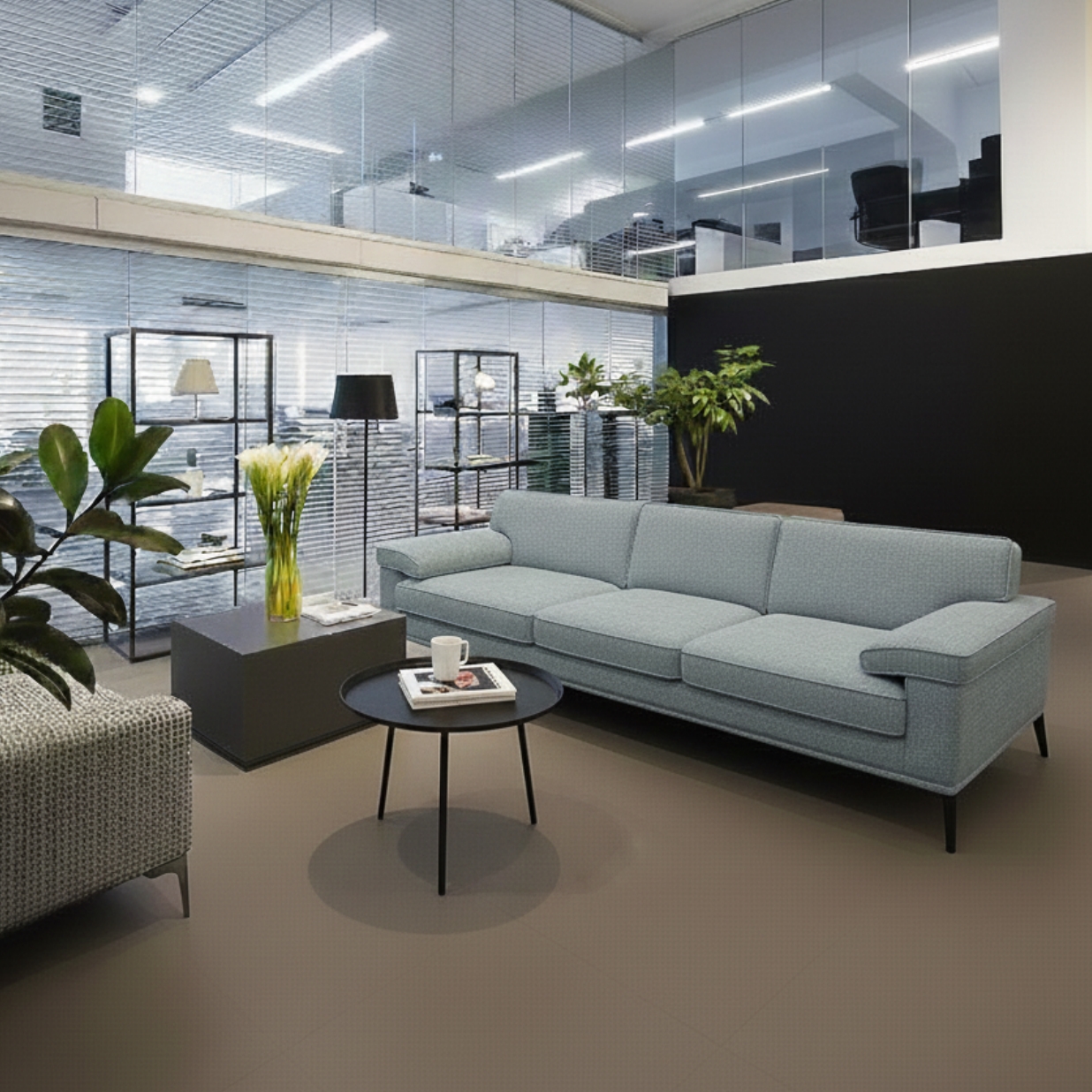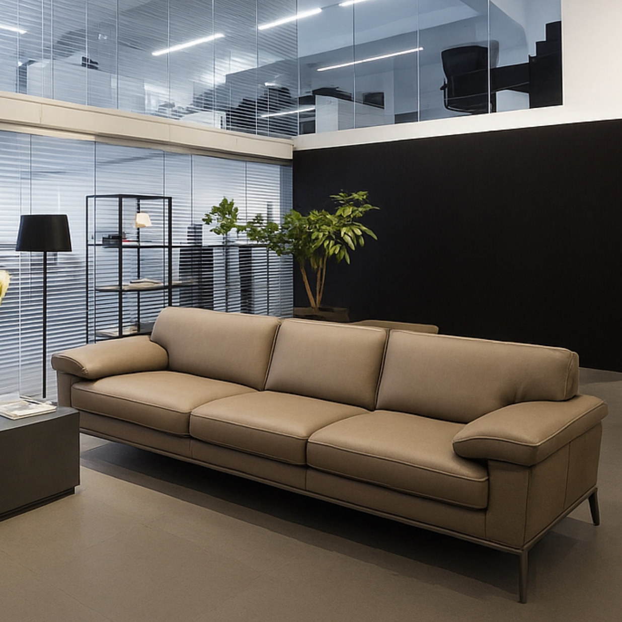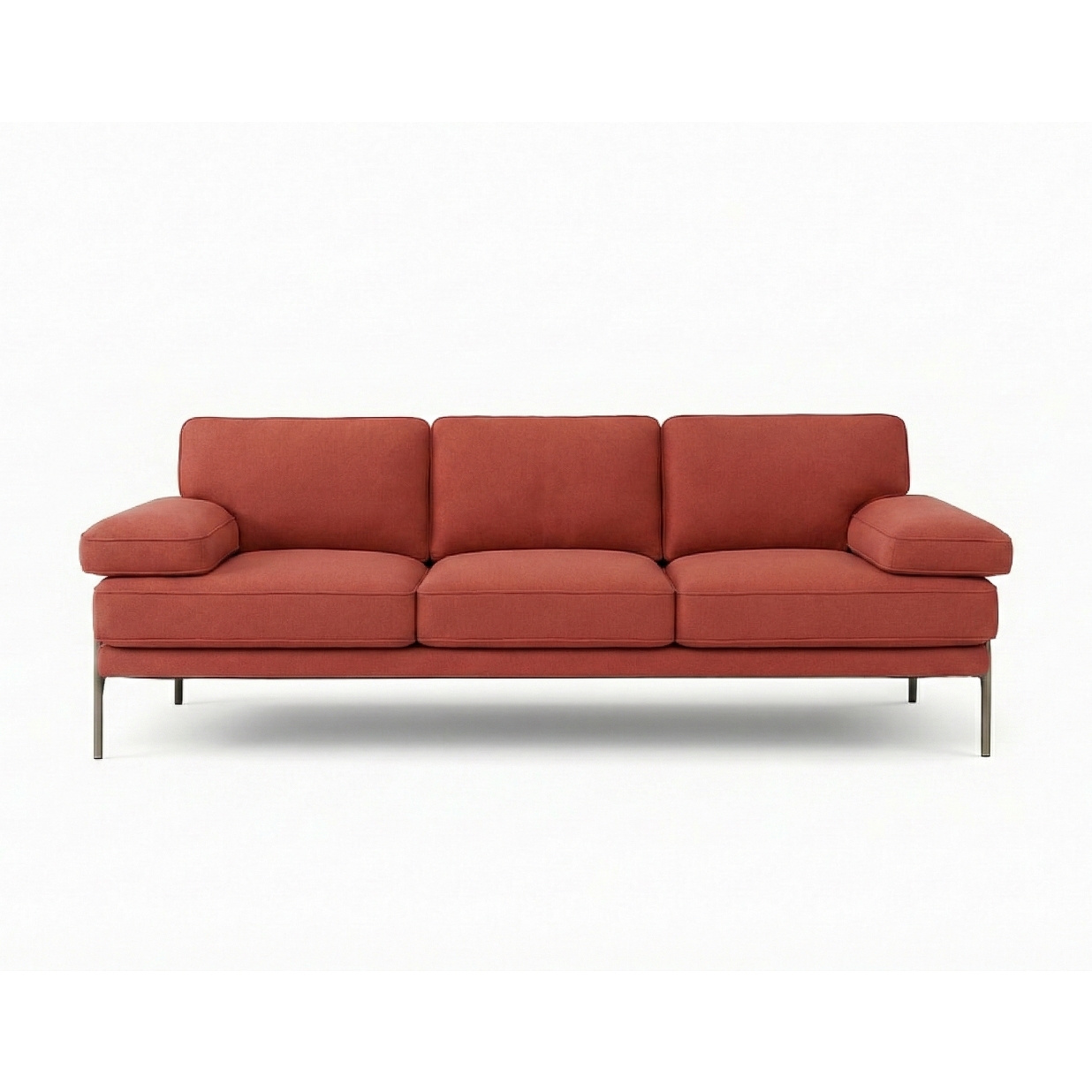 ספה במראה ביתי עם משענות צד רחבות ומזמינות ומסגרת מתכת מסוגננת, מגיעה באופציה זוגית או שלישיה